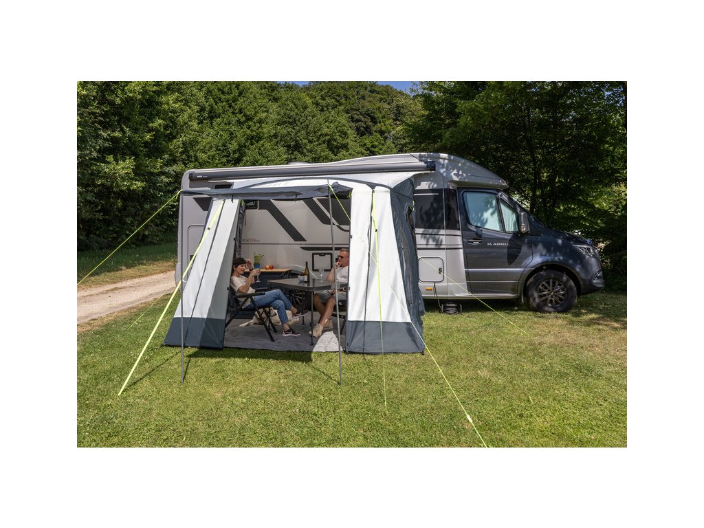 Boční stěny se zipy a látkovými vložkami umožňují variabilní montážní výšku 230–280 cm pro karavany a podobné konstrukce.