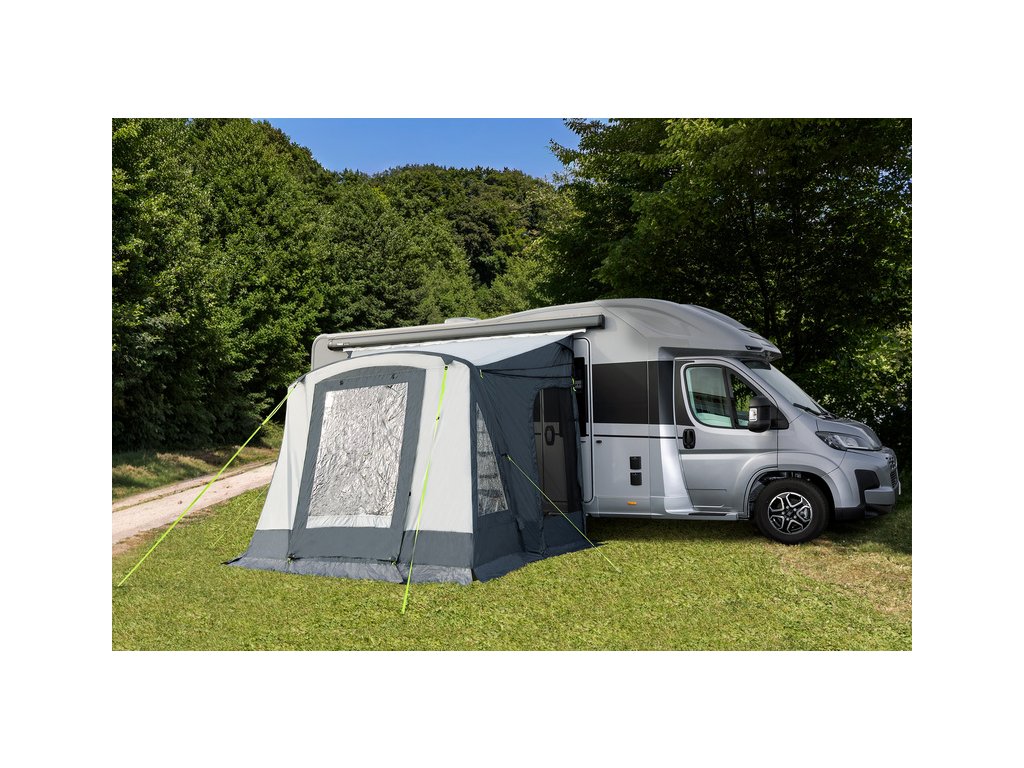 Vchodové dveře s vnitřním krytem pro soukromí, velké průhledné okno, moskytiéra po celé délce markýzy pro ochranu proti hmyzu a možnost použití jako sluneční clona. Rolovací boční dveře, také s moskytiérou. Díky dvojitému kedru (Ø 5+7 mm) je markýza vhodná pro všechna vozidla a markýzy. Pěnový měch s napínací lištou a větrnou clonou je součástí dodávky. Barva: Světle šedá/antracitová.