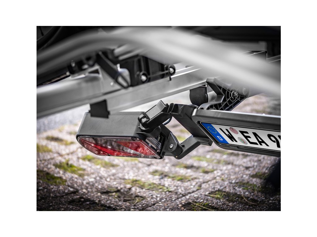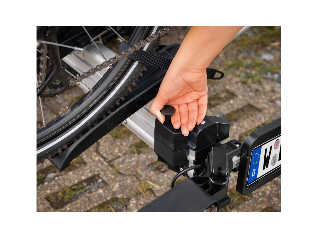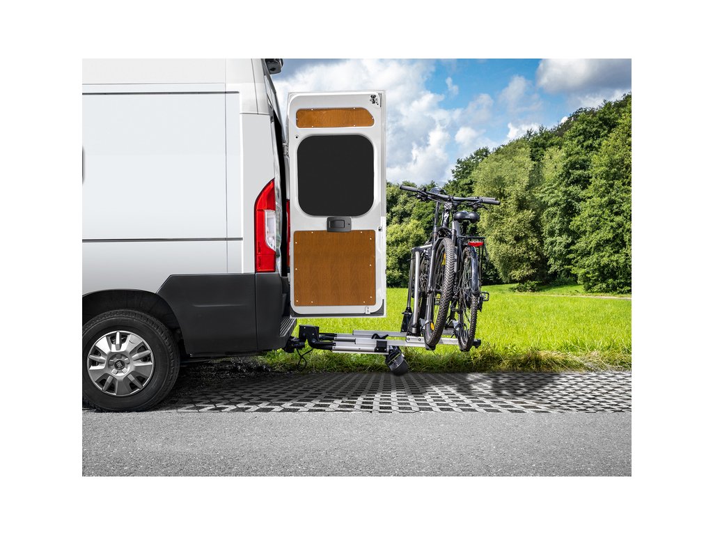 Pro přepravu dvou jízdních kol na tažném zařízení, konkrétně pro dodávky a obytné vozy, rodinné autobusy, kombi s vysokou střechou a křídlovými dveřmi a osobní automobily. Posuvná dráha 70 cm umožňuje otevírání dveří až do šířky přibližně 85 cm.