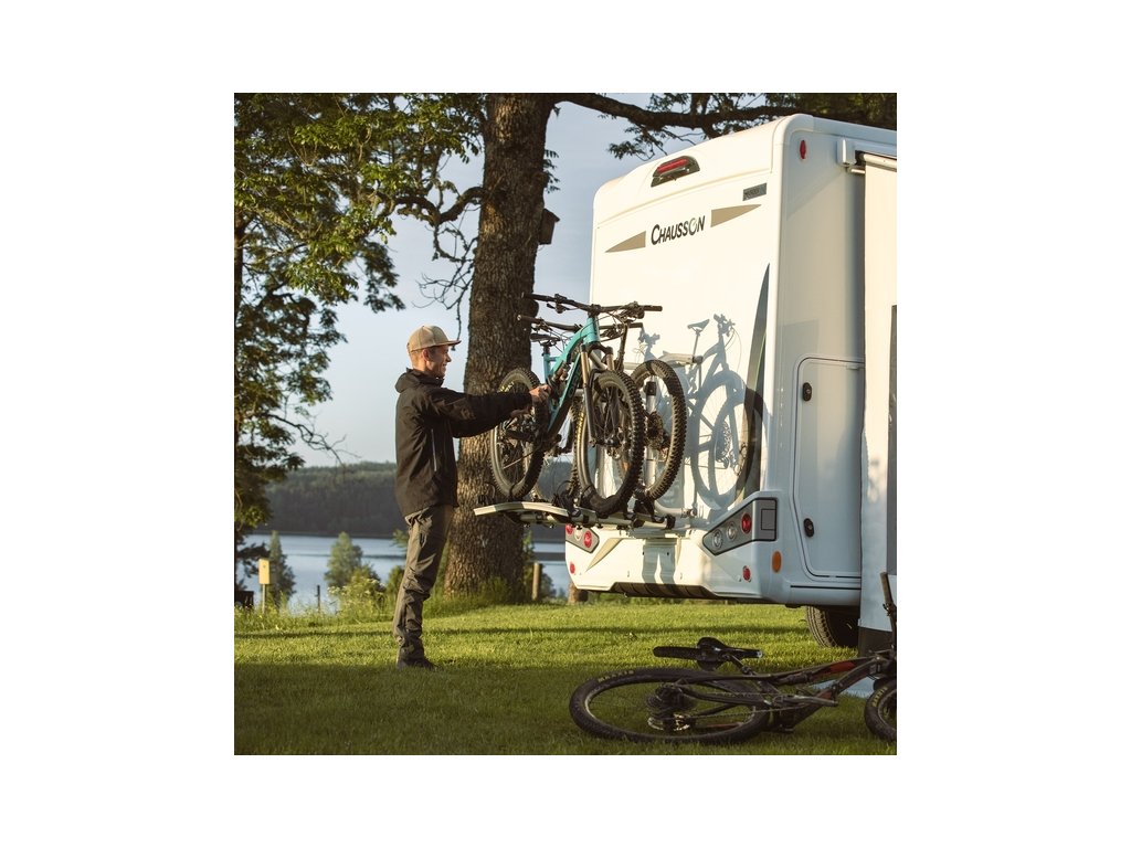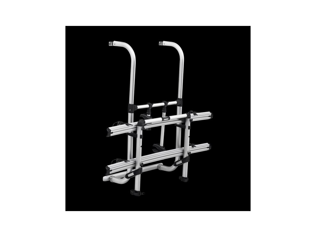 Robustní a lehký hliníkový nosič kol od Thule. Nosič kol lze snadno rozšířit až pro čtyři kola. Kolejnice, úchyty kol a držáky rámu kol jsou flexibilně nastavitelné, což umožňuje optimální uchycení kol. Zámek plošiny zabraňuje uvolnění plošiny během jízdy. Kolejnice unesou zatížení až 30 kg, takže jsou ideální pro přepravu elektrokol.