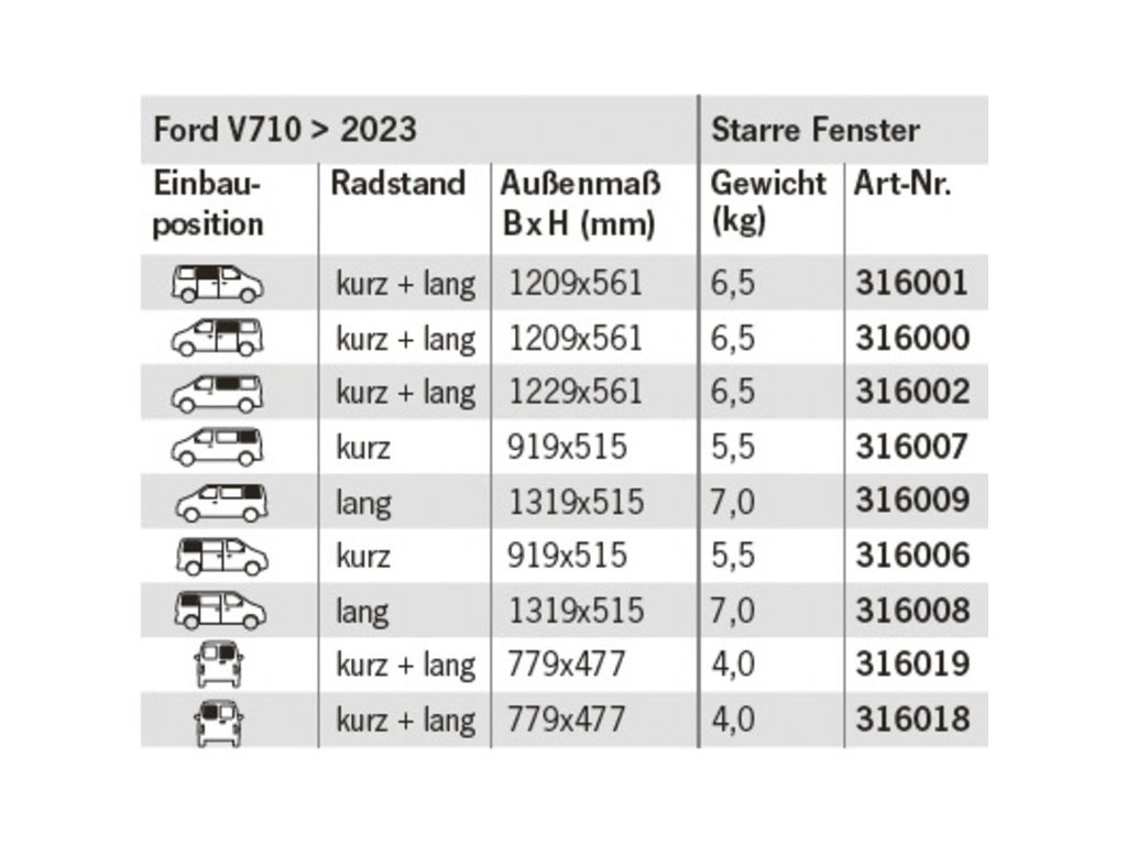 Pevné boční okno Carbest je určeno k montáži na místo levého nebo pravého okna v zadní části vozů Ford V710 (od roku 2023). Je vyrobeno z bezpečnostního skla s 18% propustností světla. Okno je dostupné ve dvou variantách.
