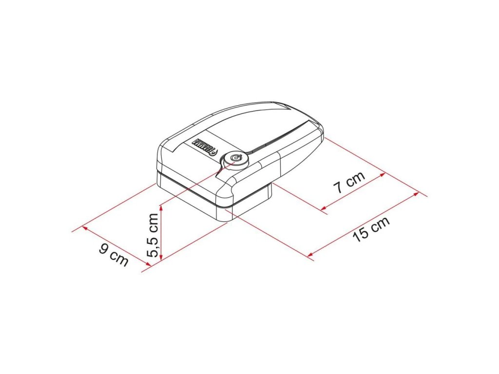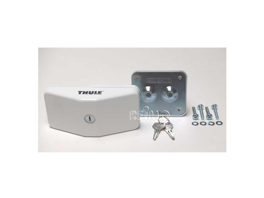 Zámek je vyroben z lakovaného hliníku. Montáž zámku se provádí do stěny karavanu.
